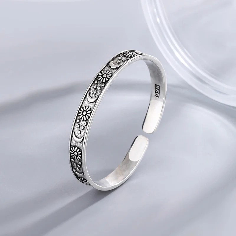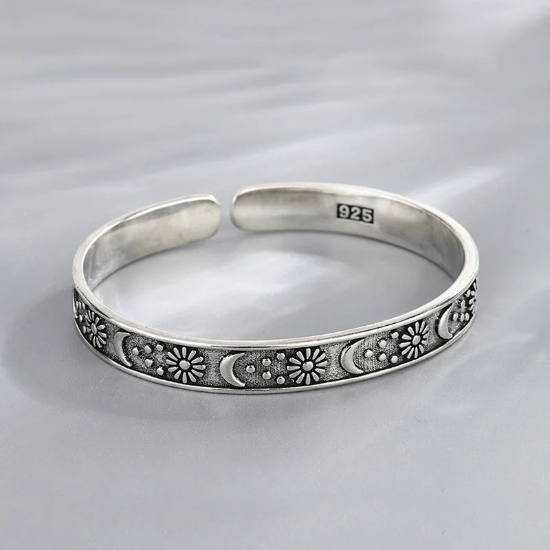 This stunning retro-inspired bangle is crafted from authentic Thai silver and showcases an artistic combination of moon and sunflower motifs. The celestial moon paired with vibrant sunflower detailing creates a harmonious balance of mystique and natural beauty.