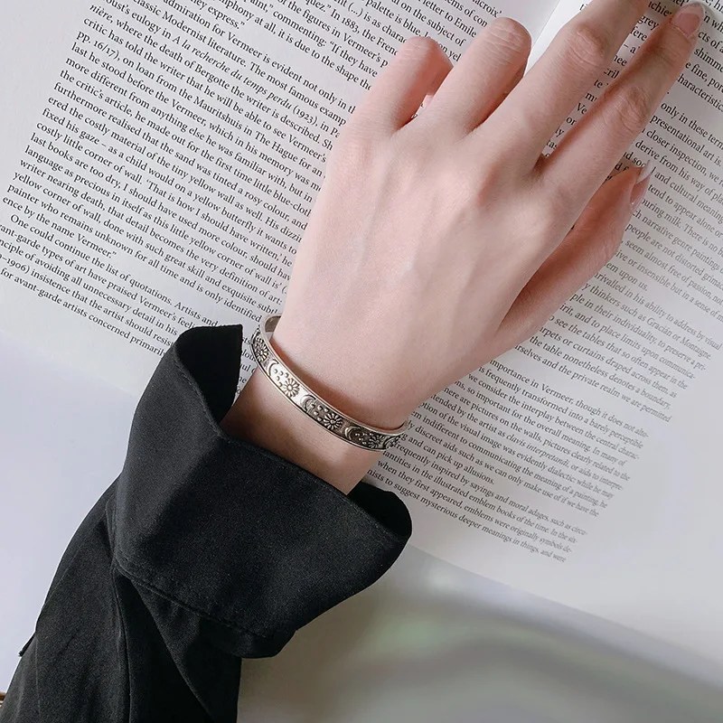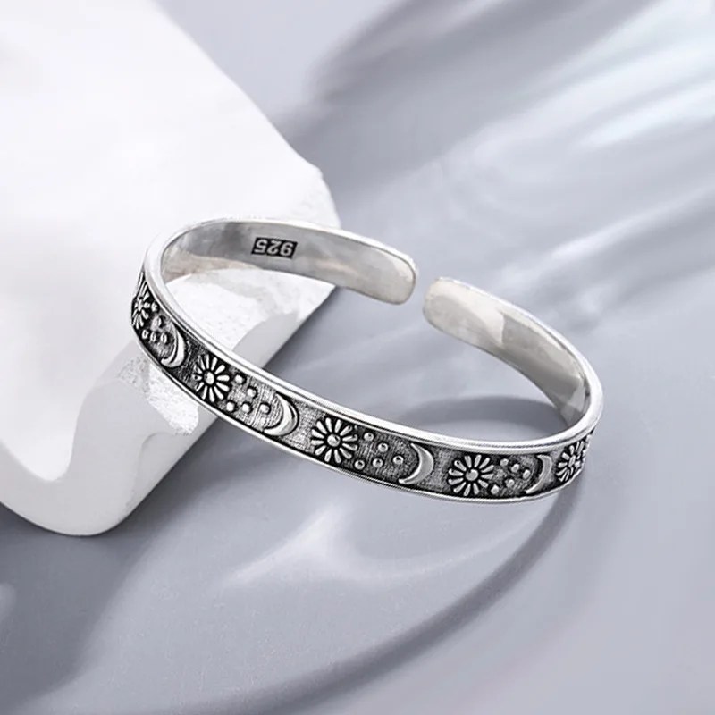 This stunning retro-inspired bangle is crafted from authentic Thai silver and showcases an artistic combination of moon and sunflower motifs. The celestial moon paired with vibrant sunflower detailing creates a harmonious balance of mystique and natural beauty.
